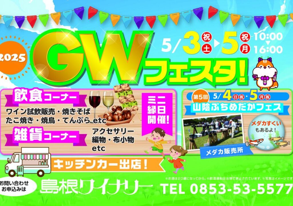 島根ワイナリーで5月3・4・5日にGWフェスタ開催!! 美味しいものやミニ縁日、めだかフェスなど楽しいものが大集合!! 10:00~16:00開催 今年のゴ···